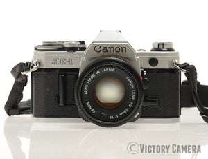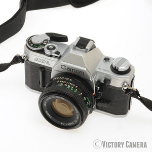 Here is a nice Canon chrome 35mm film SLR solid metal body camera with the standard 50mm f1.8 lens. It is compatible with all Canon FD lenses. This is a fully manual camera allowing individuals to dive straight into the realm of shutter speeds, ISO, manual focus, and aperture settings.