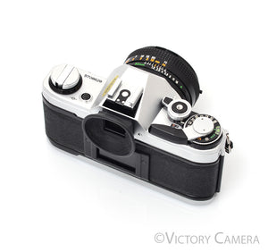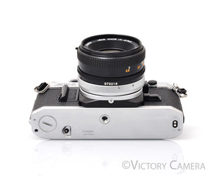 It is in excellent condition with light wear and works perfectly. The shutter and meter are accurate. The light seals have been replaced by one of our technicians, a $75 value. The lens is clean and scratch-free with no haze, fungus, nor other issues. The focus is smooth and the aperture is dry and snappy.