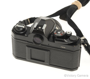 It is in excellent- condition with light wear and works perfectly. There is a dent on the side of the camera next to the frame counter window (see photos), but it is only cosmetic, it does not affect the function of the camera. The shutter and meter are accurate and the mechanical functions are smooth. The battery compartment is clean. Our technician has replaced the light seals, a $75 value. The lens is clean and scratch-free with no haze, fungus, nor other issues. The focus is smooth and the aperture is dry and snappy.