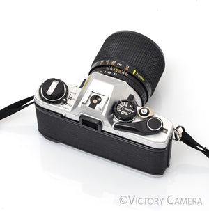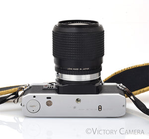 It is in excellent condition with light wear and works perfectly. The shutter and meter are accurate. The battery compartment is clean. Our technician has replaced the light seals, a $75 value. The lens is clean and scratch-free with no haze, fungus, nor other issues. The focus is smooth and the aperture is dry and snappy.