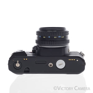 It is in excellent+ condition with light wear and works perfectly. The shutter and meter are accurate. The mechanical functions are smooth. The light seals are in good condition. The lens is clean and scratch-free with no haze, fungus, nor other issues. The focus has that Pentax smoothness and the aperture is dry and snappy.