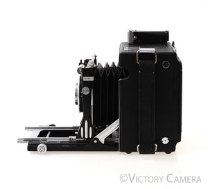 It is in excellent condition with light wear and works perfectly. The bellows are light tight and sharply pleated and the mechanical functions are smooth. The locks are tight. The shutter is strong and accurate at all speeds. The rangefinder is not accurate. The glass is clean and scratch-free with no haze, fungus, nor other issues. The aperture is smooth.