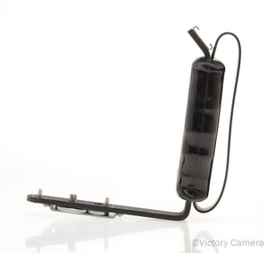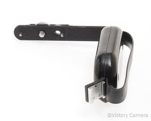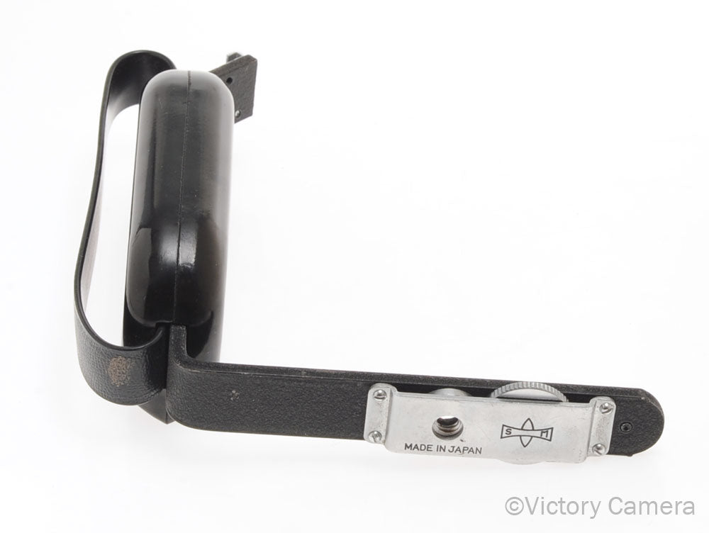 This is the "standard" Mamiya grip, which is much less common than the "Deluxe". It has no trigger but has a very secure vertical handle with an accessory shoe. It makes the TLR cameras much easier to hold. Note the anti-rotation pins; they only allow mounting on Mamiya medium format cameras.