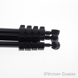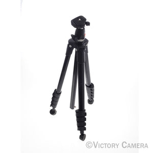This is a nice compact tripod by Manfrotto with a built-in ball head. It has a support weight of 3.3lbs, and stands at 65" with the center column extended, and 15.75" fully collapsed.
