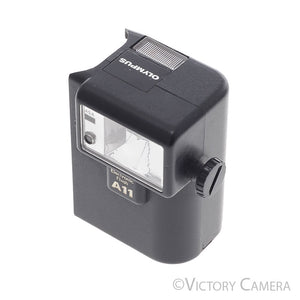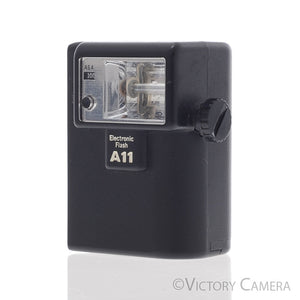 It is in excellent condition with light wear and works perfectly. The flash is strong, the ready light works, and the battery compartment is clean.