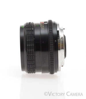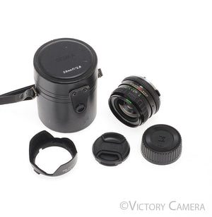 It is in excellent condition with light wear and works perfectly. The glass is clean and scratch-free with no haze, fungus, nor other issues. The focus is smooth and the aperture is dry and snappy.