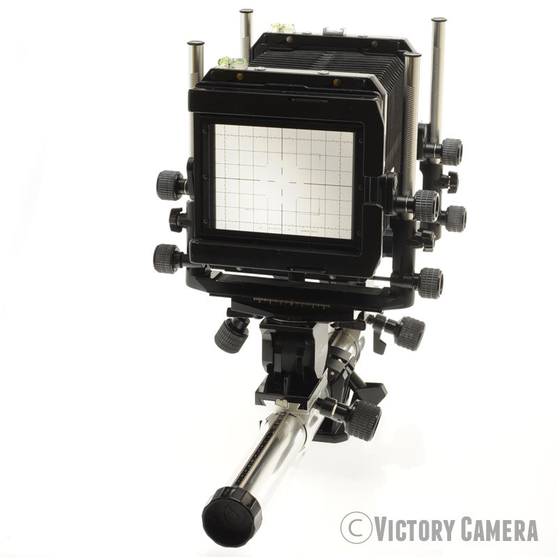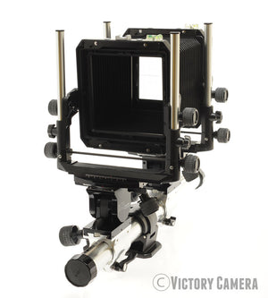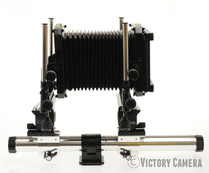 This is the late Toyo pro rail camera with base and axis tilts and a rotating back. The base rail breaks down for storage or wide angle lenses. It is a really nice camera that you can pick up for a bargain price.