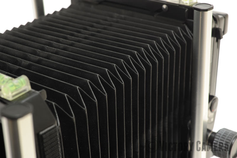 The camera is in beautiful condition and works perfectly. All of the movements are smooth and lock tightly. The ground glass is clean. The bellows is light-tight and sharply pleated.