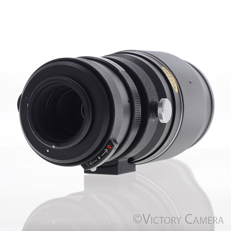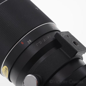 It is in excellent- condition with light wear and works perfectly. There is a small engraving on the side of the lens. This is purely cosmetic and does not affect the function of the lens nor the image quality. The glass is clean and scratch-free with no haze, fungus, nor other issues. The focus is smooth and the aperture is dry and snappy.