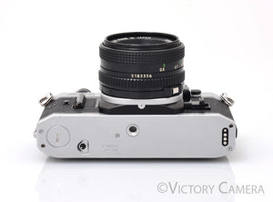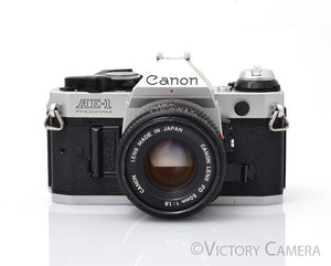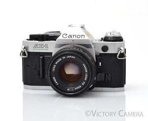 Here is a nice Canon 35mm film SLR camera with the standard 50mm f1.8 lens. It is compatible with all Canon FD lenses. It has a full range of manual settings allowing individuals to dive straight into the realm of shutter speeds, ISO, manual focus, and aperture settings as well as a few auto modes for fast shooting.