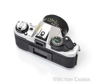 It is in excellent- condition with light wear and works perfectly. There is some cosmetic damage on the back left side of the body. This is purely cosmetic and does not affect the function of the camera, nor the image quality. The shutter and meter are accurate. The light seals are in good condition. The lens is clean and scratch-free with no haze, fungus, nor other issues. The focus is smooth and the aperture is dry and snappy.