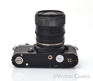 This one is in good condition with moderate cosmetic wear. There are two small dents in the top plate (see photos), but they are only cosmetic, they do not affect the function of the camera. The shutter and meter are accurate and the battery compartment is clean. The mechanical functions are smooth. The lens is clean and scratch free with no haze, fungus, nor other issues. The focus and zoom are smooth and the aperture is dry and snappy.