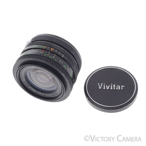 It is in excellent- condition with some minor cosmetic wear and works perfectly. The glass is clean and scratch-free with no haze, fungus, nor other issues. The focus is smooth and the aperture is dry and snappy.
