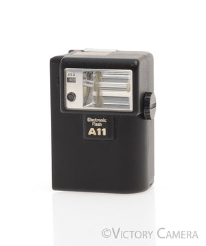 It is in excellent+ condition with light wear and works perfectly. The flash is strong, the ready light works, and the battery compartment is clean.