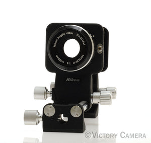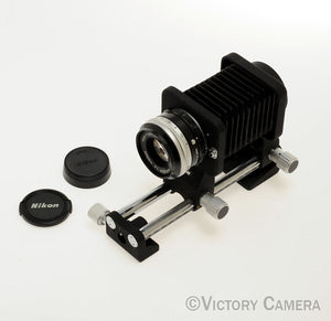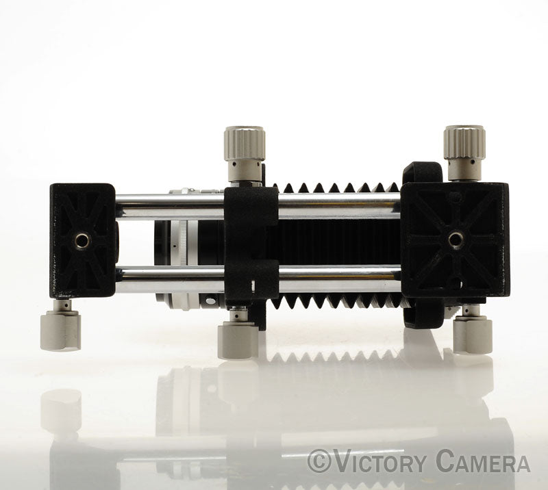 It is in excellent+ condition with light wear and works perfectly. The glass is clean and scratch-free with no haze, fungus, nor other issues. The aperture is smooth. Be aware that it uses a preset aperture system, meaning you set the aperture with one ring and engage it with another. The bellows are sharply pleated and light tight. The movements are smooth.