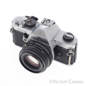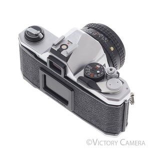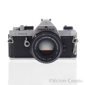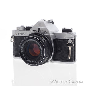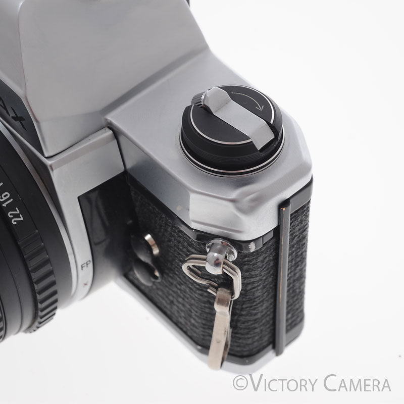 It is in excellent condition with light wear and works perfectly. There is a small dent near the rewind knob, but it does not affect the function of the camera. The shutter and meter are accurate and the mechanical functions are smooth. We have replaced the light seals (a $75 value). The glass is clean and scratch-free with no haze, fungus, nor other issues. The focus has that Pentax smoothness and the aperture is dry and snappy.