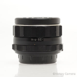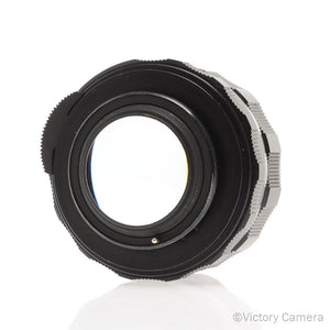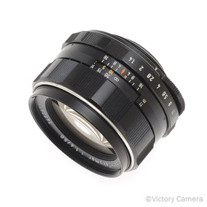 This is the fast standard manual focus lens for Pentax M42 mount cameras. This is the 8 element version with the IR mark to the right of the 4 and no model number. The thorium lenses have a tendency to have a yellow tint to the glass, this one has clear glass.