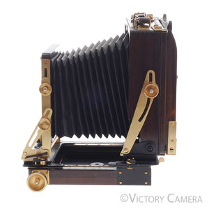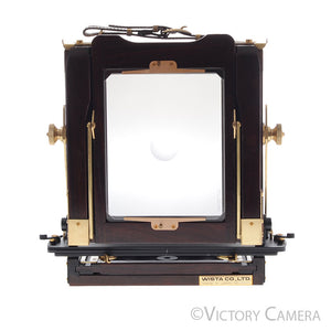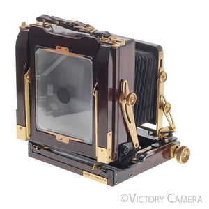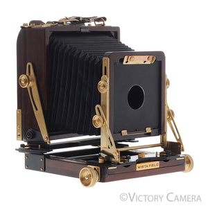 This is a beautiful red wood and gold metal 4x5 field camera made by Wista.