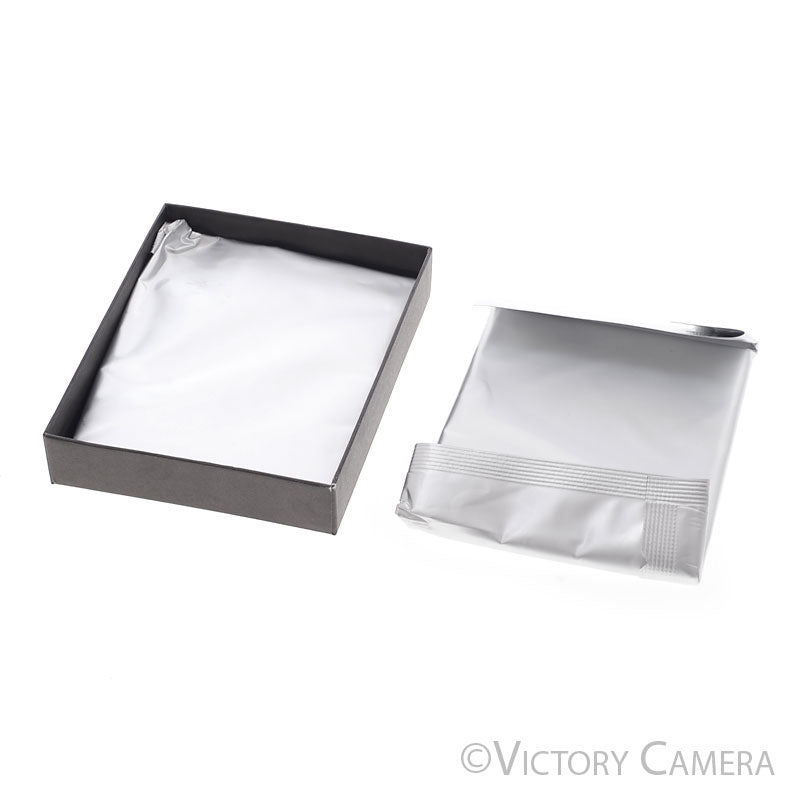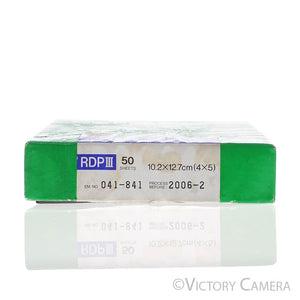 This is an opened box of 4x5 Fuji Velvia 100F. It it expired in February 2006 and we do not know its storage history, the box is open and the outside of the box is damaged. I opened the box in a dark room to feel for how many sheets are in it. One of the wrapped sheet groups is completely sealed, and the other one is open. I would suspect there are maybe 10-20 sheets in the box total.