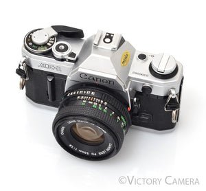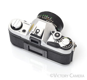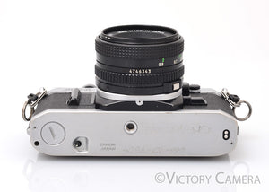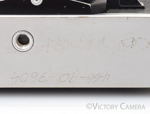 It is in excellent condition with light wear, everything works perfectly. There is an engraving on the bottom plate, but it is only cosmetic, it does not affect the function of the camera. The shutter and meter are accurate. The mechanical functions are smooth. There is no shutter squeak. Our technician has replaced the light seals, a $75 value. The lens is clean and scratch-free with no haze, fungus, nor other issues. The focus is smooth and the aperture is dry and snappy.