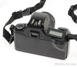 It is in excellent- condition with light wear and works perfectly. There is some LCD bleed in the viewfinder, but this is purely cosmetic and does not affect the function of the camera nor the image quality. The LCD bleed is not obstructing the meter in the viewfinder. The glass is clean and scratch-free with no haze, fungus, nor other issues. The autofocus is accurate and the mechanical movements are smooth. The aperture is dry and snappy.