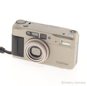 This is the Contax TVS II, it's like the T2 but with a zoom lens. It's a high end point and shoot with a titanium finish and a high quality zoom lens with the famous Zeiss T* coating.