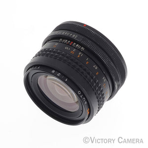 It is in excellent- condition with moderate cosmetic wear and works perfectly. The glass is clean and scratch-free with no haze, fungus, nor other issues. The focus is smooth and the aperture is dry and snappy.