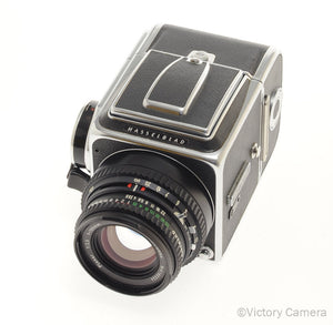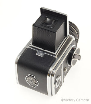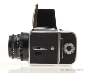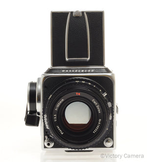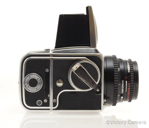 This is the classic design C. It comes complete with the Planar 100mm f3.5 C lens, the 12 exposure square back, the waist level finder, and the standard winder.