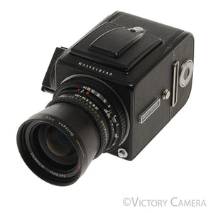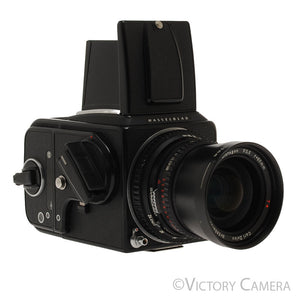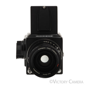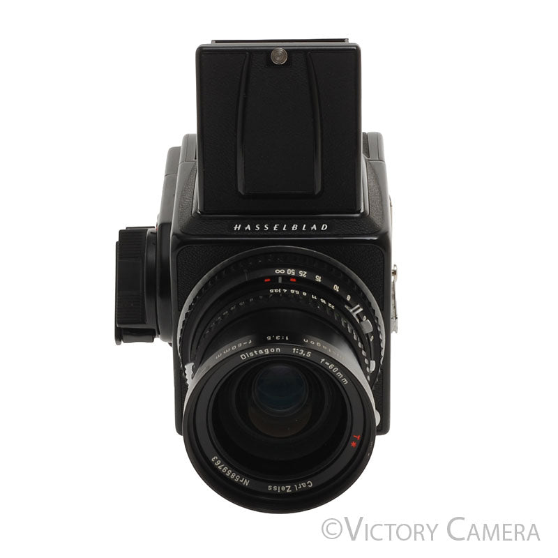 This is the classic design CM. It comes complete with the slightly wide 60mm Distagon lens, the A12 exposure square back, the standard waist level finder, and the rapid winding lever.