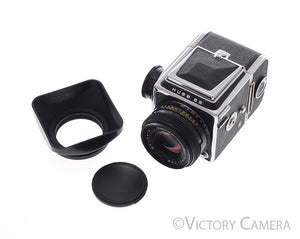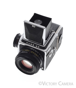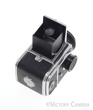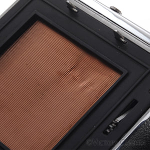 It is in excellent condition with light wear and works perfectly. The shutter is strong and accurate at all speeds and the mechanical functions are smooth. There is a small dent in one of the shutter curtains (see photos) but the curtain is light tight and the dent does not affect its movement. The glass is clean and scratch-free with no haze, fungus, nor other issues and a light amount of dust inside. The focus is smooth and the aperture is dry and snappy.