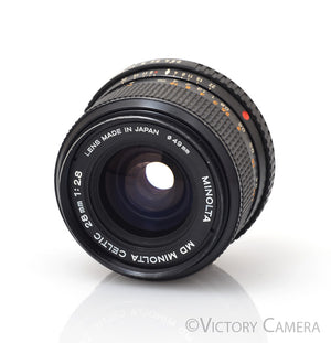 This is a nice wide angle prime lens for Minolta manual focus film cameras. It would be an excellent lens for landscapes, street photography, or architecture.