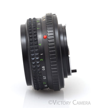 This lens is in excellent+ condition with light wear and works perfectly. The glass is clean and scratch-free. The focus is smooth and the aperture is dry and snappy.