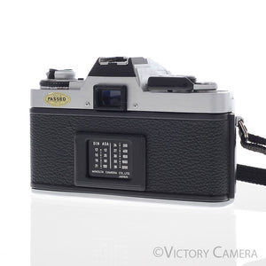 It is in excellent condition with light wear and works perfectly. The shutter and meter are accurate and the mechanical functions are smooth. The battery compartment is clean. Our technician has replaced the light seals, a $75 value. The lens is clean and scratch-free with no haze, fungus, nor other issues. The focus is smooth and the aperture is dry and snappy.