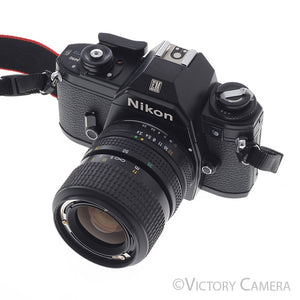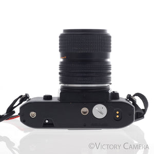 It is in excellent- condition with light wear and works perfectly. The lens is missing its front name ring. It is only cosmetic, it does not affect the function of the lens. The glass is clean and scratch-free with no haze, fungus, nor other issues. The focus and zoom are smooth aand the aperture is dry and snappy. The camera is in excellent condition. The shutter and meter are accurate and the mechanical functions are smooth. We have replaced the light seals, a $75 value.