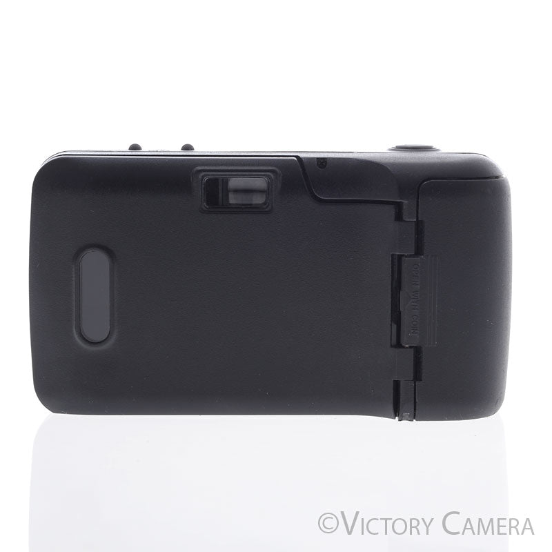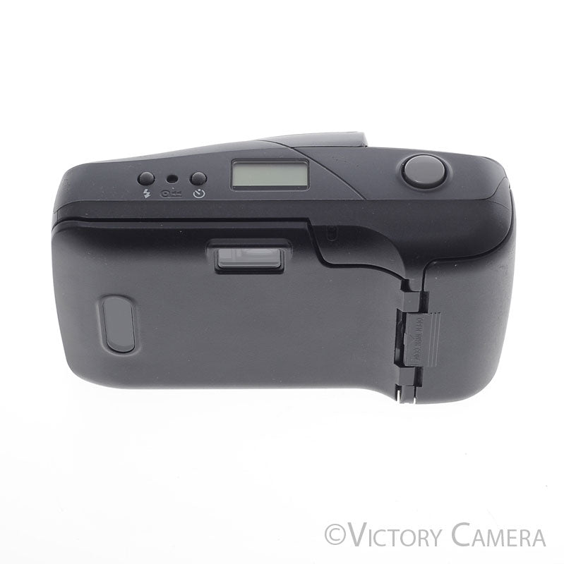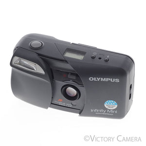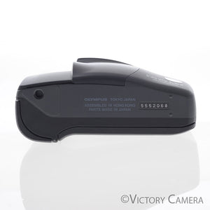 This is an excellent point and shoot film camera made by Olympus with a sliding door lens cover and a sharp 35mm f3.5 wide angle prime lens. It would be an excellent camera to carry with you for day-to-day photography or for travel.