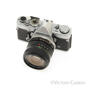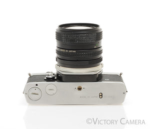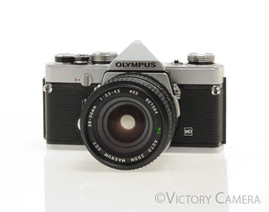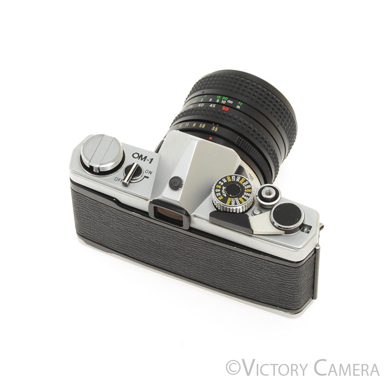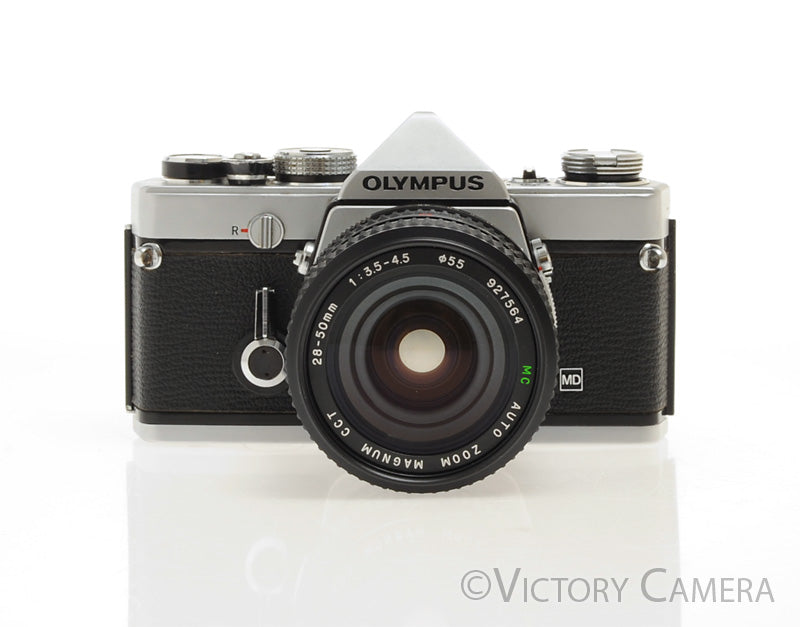 It is in excellent condition with light wear and works perfectly. The shutter and meter are accurate and everything works perfectly. The camera comes with the excellent 28-50mm f3.5-4.5 zoom lens. It has smooth focus and clean scratch-free glass. Everything works perfectly. We have replaced the light seals (a $75 value).