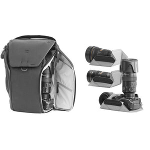 Carry your camera bag and other necessities with the 20L Everyday Backpack v2 in charcoal from Peak Design. This versatile bag is designed for photographers, multimedia creators, or anyone seeking a pack that is size adjustable and compressible. Multiple magnetic latches on the top flap allow you to adjust the height of the pack from 18.3 to 22.3". The interior has three dividers so you can stack items in the main compartment. The dividers have foldout surfaces that can be configured to cushion and hold items against the pack's zippered side openings. The side openings are positioned to face you when the bag is rotated from back to front with either side facing upward. The dividers allow you to choose which items are most quickly accessed from the sides.