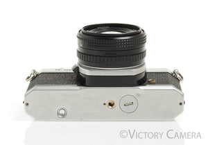 It is in excellent condition with light wear and works perfectly. There is a very small dent on the prism and bottom plate (see photos) but they are minor and only cosmetic, they do not affect the function of the camera. The shutter and meter are accurate and the mechanical functions are smooth. Our technician has replaced the light seals, a $75 value. The lens is clean and scratch-free with no haze, fungus, nor other issues. The focus and zoom are smooth and the aperture is dry and snappy.