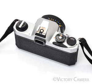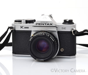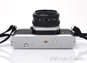The camera is in excellent- condition with light wear and works perfectly. There is a dent on the bottom left corner of the camera body, this does not affect the image quality nor function of the camera. The shutter and meter are accurate and the mechanical functions are smooth.