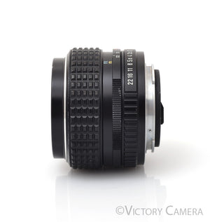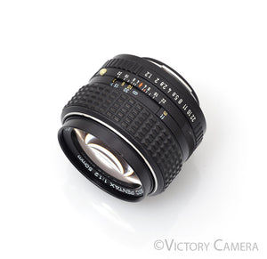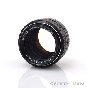 This is the fairly rare fast standard lens in Pentax K mount. It is able to open up to f1.2, perfect for lowlight conditions or beautiful focus falloff. The lens caps are included. This is a nice lens.