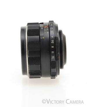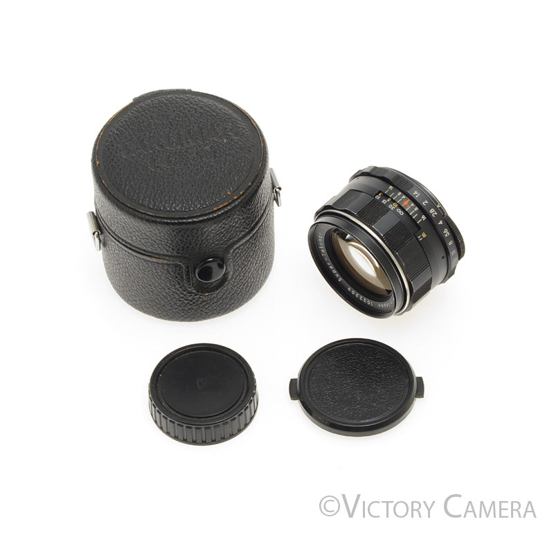 This is the fast standard manual focus lens for Pentax M42 mount cameras. This is the 8 element version with the IR mark to the right of the 4. The thorium lenses have a tendency to have a yellow tint to the glass, this one has clear glass with hardly any of the yellow tint.